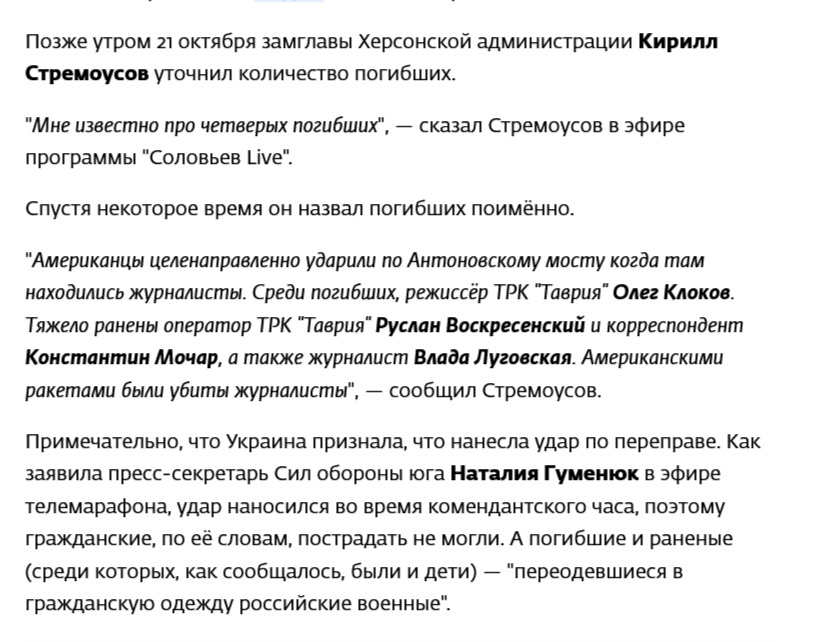 Упоминание настоящих имени и фамилии сотрудника ТРК “Таврия” Константина Мочара именно как человека, имеющего отношение к херсонскому пропагандистскому медиа, в сети встречается лишь дважды. Оба раза – в связи с обстрелами ВСУ переправы возле Антоновского моста 20 октября 2022 года, под который попали пропагандисты.Однажды в сообщении российского “РИА Новости” Константин Мочар был назван среди раненых во время этого обстрела сотрудников телеканала. Второй раз его упомянул тогдашний оккупационный “заместитель главы администрации Херсонской области” Кирилл Стремоусов, комментируя тот же обстрел.