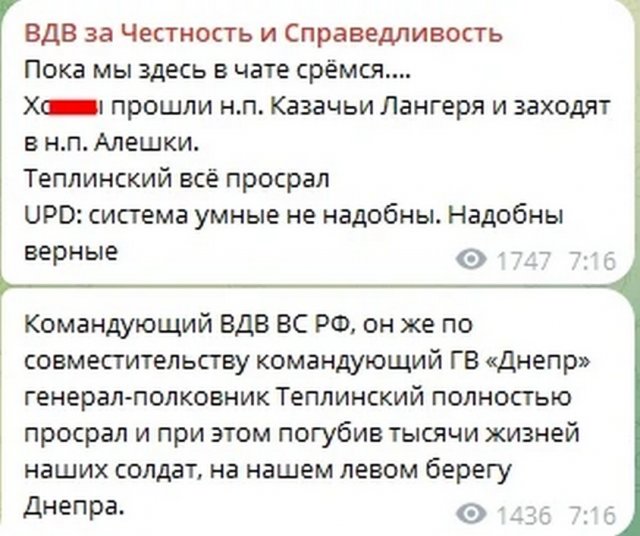 "Поки ми тут у чаті з*ємось... Х***и (українці - ред.) пройшли н.п. Козачі Табори і заходять у н.п. Олешки. Теплинський (командувач російським угрупуванням на Херсонському напрямку - ред.) всі прос*ав… Командувач ВДВ ЗС РФ, він же за сумісництвом командувач ГВ "Дніпро" генерал-полковник Теплинський, повністю прос*ав, і при цьому, занапастивши тисячі життів наших солдатів, на нашому лівому березі Дніпра", - написав ресурс.