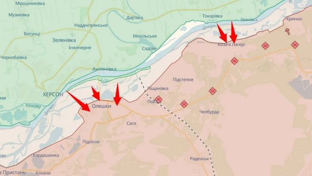 Відомо, що на лівобережжі Херсонської області ЗСУ планомірно створюють та розширюють плацдарми, туди перекидається важка техніка.Раніше повідомлялось, що ЗСУ перерізали трасу з Олешок на Нову Каховку у двох місцях.