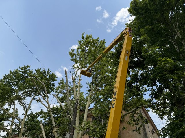Обстрілами посікло дерева. Спиляти надламані гілки приїхали працівники КП "Парки Херсона".