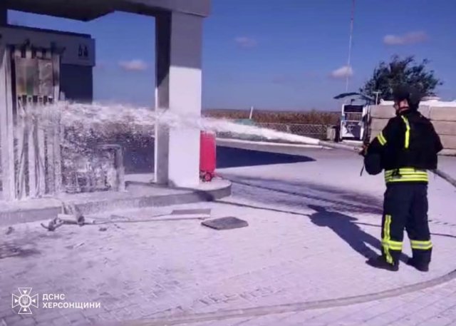 Ще одна пожежа через скиду вибухівки з ворожого БПЛА виникла в с.Білозерка: горіла паливна колонка на автозаправній станції.