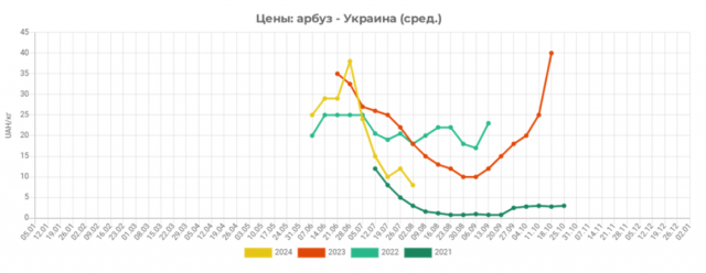 Наразі ціни на кавуни на внутрішньому ринку вже опустилися до 3-8 грн/кг ($0,07-0,19/кг), що в середньому на 30% дешевше, ніж наприкінці минулого робочого тижня. Негативну цінову динаміку виробники пояснюють різким збільшенням пропозиції цих баштанних на ринку. За словами фермерів, ситуація ускладнюється ще й тим, що основну частку пропозиції становить продукція великого калібру, попит на яку досить слабкий. Оптові компанії та роздрібні мережі скорочують закупівлі такого кавуна до мінімуму, посилаючись на вкрай невисокі темпи продажів у роздробі.