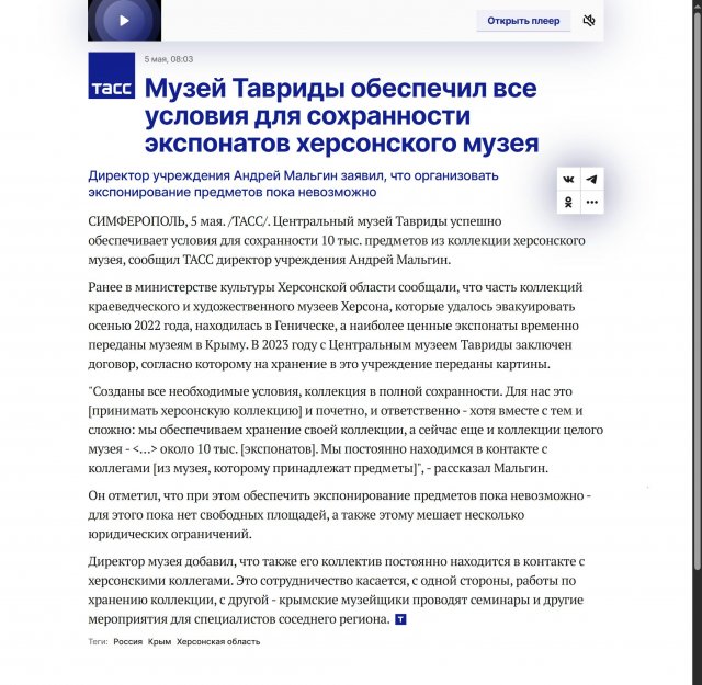 Більше року директор Центрального музею Тавриди Андрій Мальгін не давав коментарів щодо долі мистецької колекції, яка під приводом фейкової «евакуації» була вивезена з Херсона до очолюваного ним закладу. Після довгого мовчання він підтвердив головній пропагандистській агенції Росії ТАСС той факт, що значна частина колекції Херсонського художнього музею продовжує перебувати під контролем російської установи на окупованій території, а саме у Центральному музеї Тавриди. Інформація про це опублікована 5 травня 2025 року.