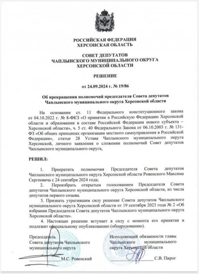 Про конфлікт в окупаційному керівництві Чаплинки ми вже писали. Там, нагадаємо, голова окупаційної адміністрації Лілія Пуляєва оголосила війну голови окупаційної ради депутатів Чаплинського «муніципального округу» Максиму Ровенському. У цій війні вона зрештою і перемогла - Ровенського залишили без посади.Війна, варто також нагадати, почалась через те, що Ровенський, буцімто, не підписав протоколи про виділення безхазяйних земель, тож Пуляєва, заручившись підтримкою окупаційного керівництва області, змогла добитись зняття незговірливого колеги. При цьому під рішенням окупаційної ради навіть її підпис не стоїть. Замість неї це зробив виконуючий обов’язки голови «адміністрації» «округу» Пирог. Новим головою окупаційної ради став лояльний до керівництва окупаційної адміністрації Володимир Домбровський - директор окупаційного культурно-дозвільного центру у Чаплинці. Лілія Пуляєва, яка «за дивним збігом обставин» знову «стала» головою «округу» відразу після сесії, вже провела разом з Домбровським зустріч з представниками «шефів» з Рязанської області.