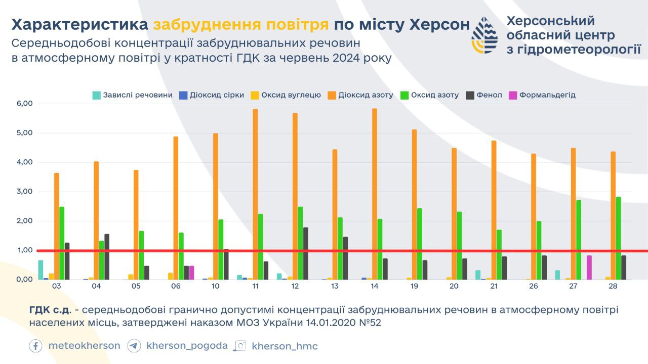 Протягом червня 2024 року фахівці зафіксували, що середньодобові концентрації забруднювальних речовин в атмосферному повітрі Херсона були перевищені.