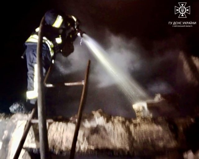 Головне Управління ДСНС України у Херсонській області у facebook опублікувало фото гасіння пожеж після нічгних обстрілів Херсона."Протягом минулої доби ворог неодноразова атакував населені пункти Херсонського та Бериславського районів.