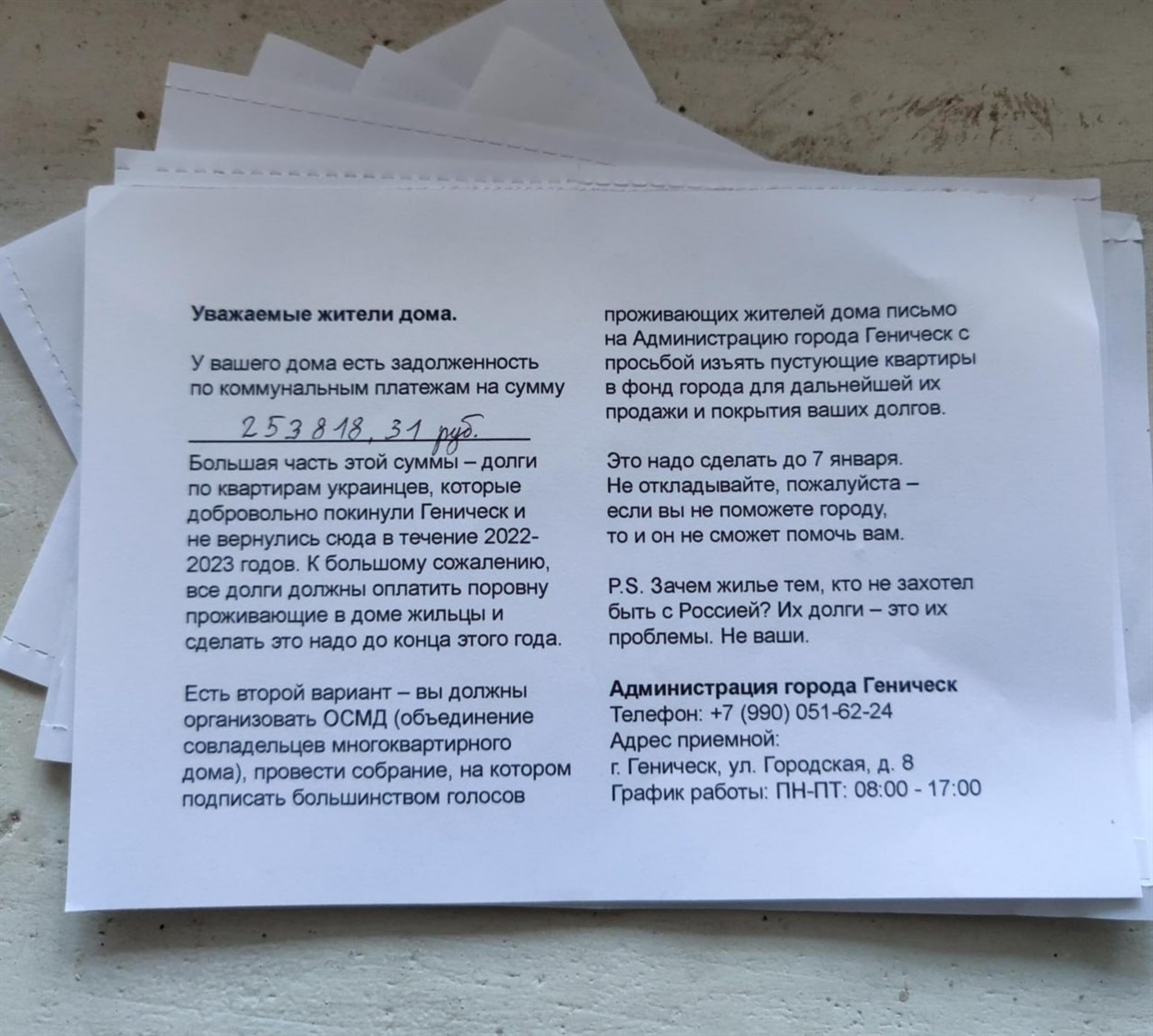Схема, яку впроваджують колаборанти, проста. Спочатку на багатоквартирний будинок “навішують” борги по комуналці. Потім примушують сплатити ці борги тим мешканцям, які залишилися. Далі ставлять людей перед вибором: або погасити ці борги, або допомогти місцевій окупаційній “адміністрації” віджати квартири тих мешканців, що виїхали з міста.А для цього до 7 січня пропонують створити об'єднання співвласників і написати листа в адміністрацію з проханням вилучити квартири тих, хто виїхав.