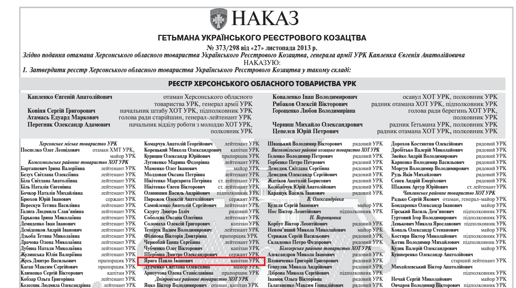 Нам вдалося знайти дані про те, що капітан Павло Ярига 27 листопада 2013 року був включений до реєстру Херсонського обласного товариства Українського реєстрового козацтва.