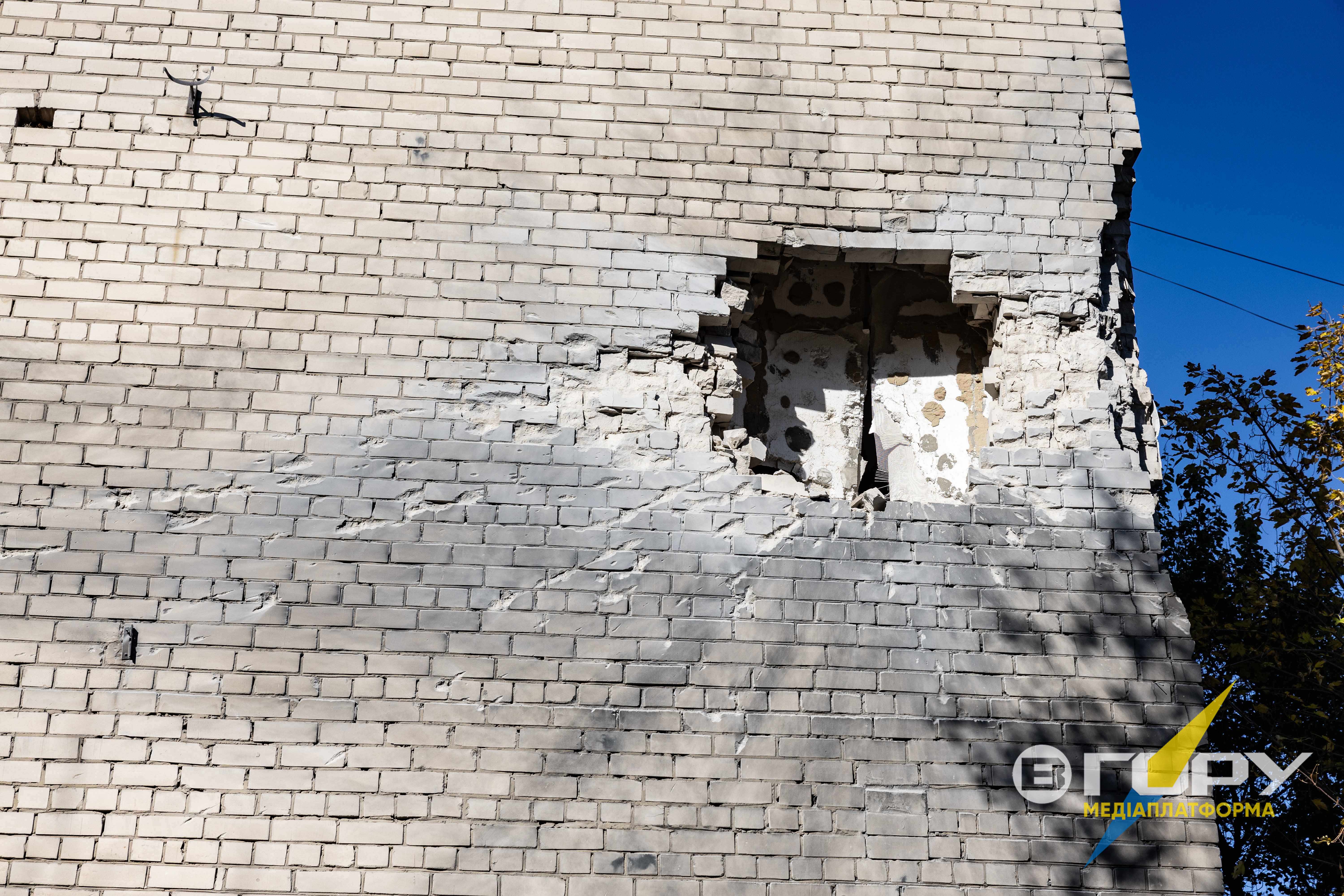 У стіні будівлі дірка, пошкоджені столи та техніка. Також вибите скло, на землі лежать уламки від снарядів і каміння.