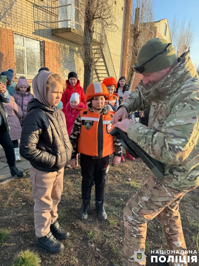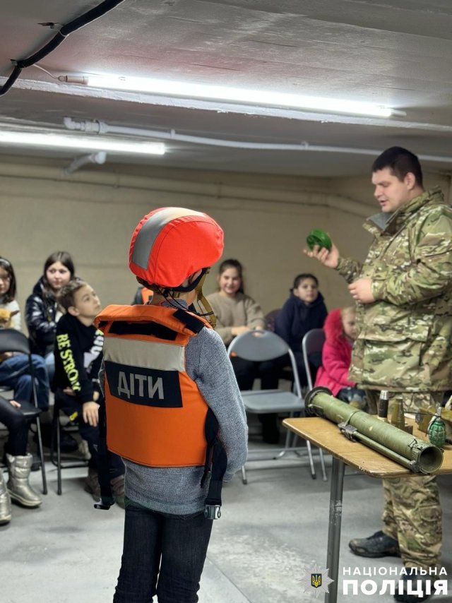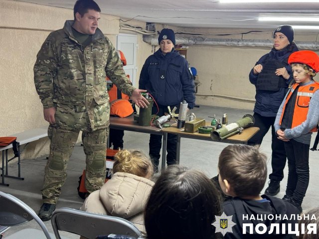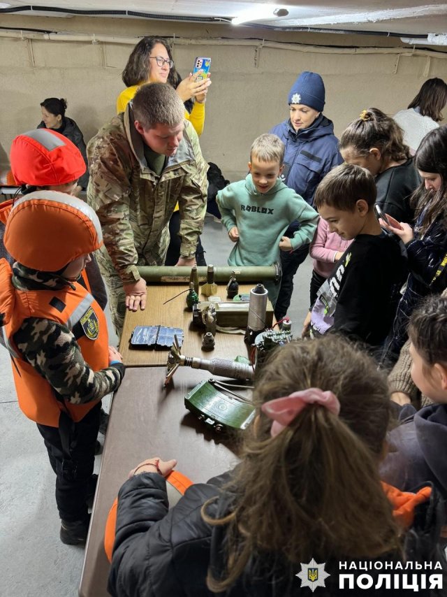 Працівник вибухотехнічного відділу продемонстрував дітям макети вибухонебезпечних предметів та розповів про смертельну небезпеку, яку вони становлять. Акцентував увагу дітей, що після обстрілів ні в якому разі не можна брати до рук небезпечні знахідки, а негайно повідомити про подію дорослим чи зателефонувати на «102» або «101».Діткам нагадали, що у разі небезпечної ситуації вони мають телефонувати в поліцію, їм обов’язково прийдуть на допомогу або підкажуть, як діяти.