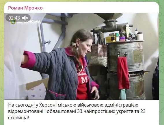Роман Мрочко, голова Херсонської міської військової адміністрації, регулярно публікує у своєму Телеграм-каналі фото з відремонтованих укриттів. І подяки мешканців будинків, яким тепер є де сховатись від обстрілів, що тривають і вдень і вночі. Слово «укриття» в Телеграм-каналі Мрочка зустрічається 73 рази, і майже кожне повідомлення – із точною адресою кожного облаштованого підвалу чи вуличної споруди. Одні люди дякують міській владі, інші – дивуються, навіщо цей піар чиновників супроводжується поширенням точних адрес об’єктів.