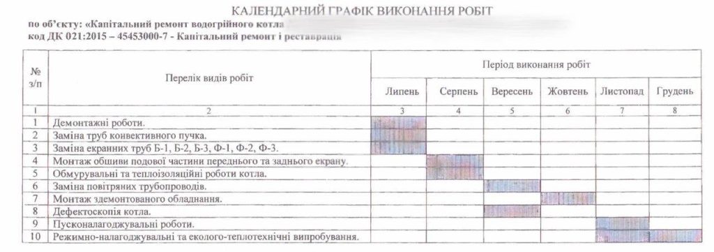 Згідно з договором, ремонтні роботи на одному із запланованих об’єктів триватимуть до кінця року. Перелік робіт представлений нижче: