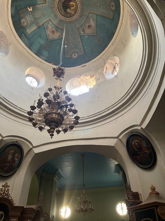 Один зі снарядів влучив у світловий барабан під куполом. У єпархії УПЦ МП повідомили, що значних пошкоджень зазнав фасад та інтер’єр церкви.