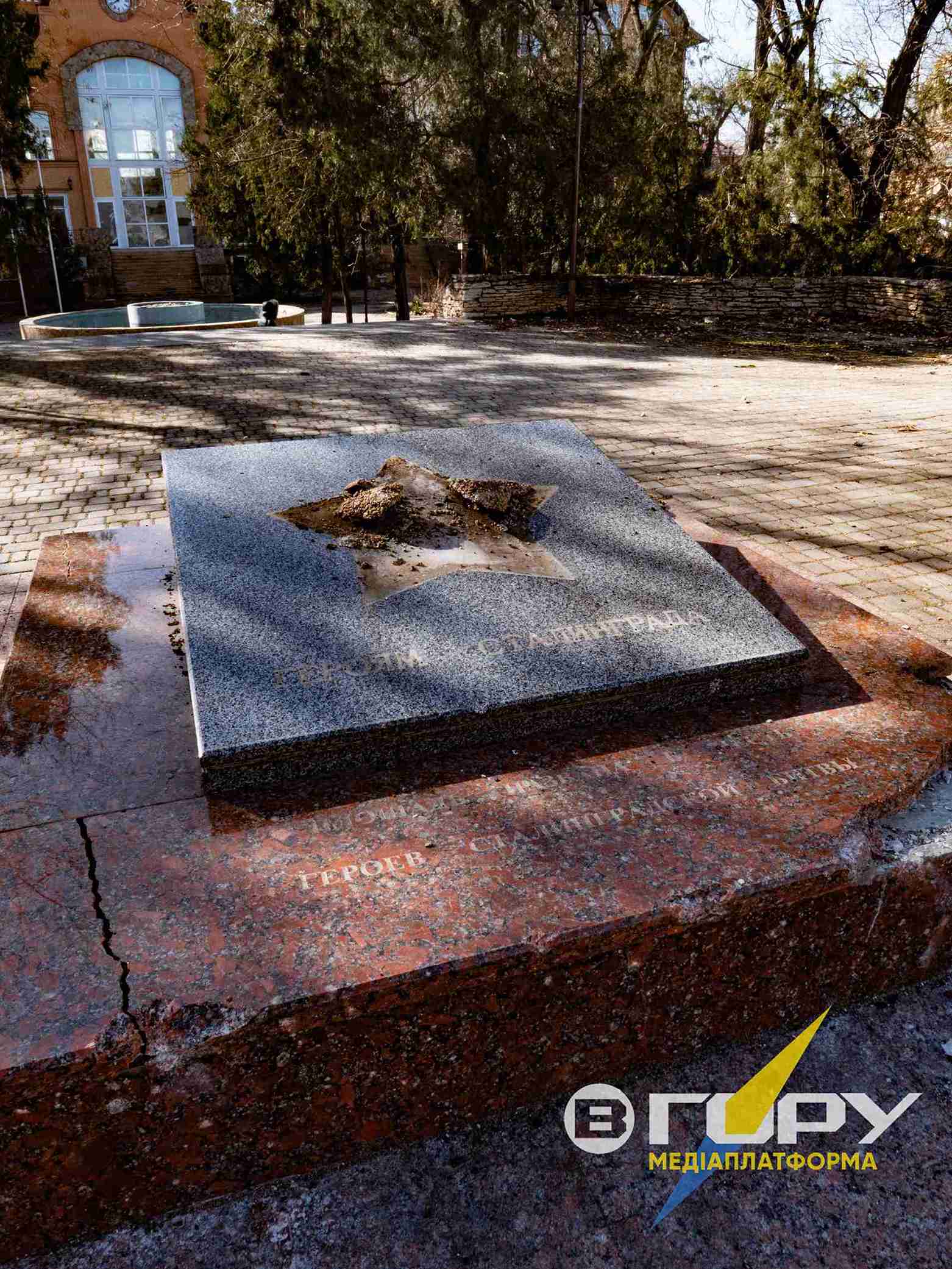 У Херсоні розібрали зірку на пам’ятному знаку “Героям Сталінграда”.27 лютого фотокореспондент Медіаплатформи “Вгору” Олександр Андрющенко зробив світлини пошкодженого знаку.