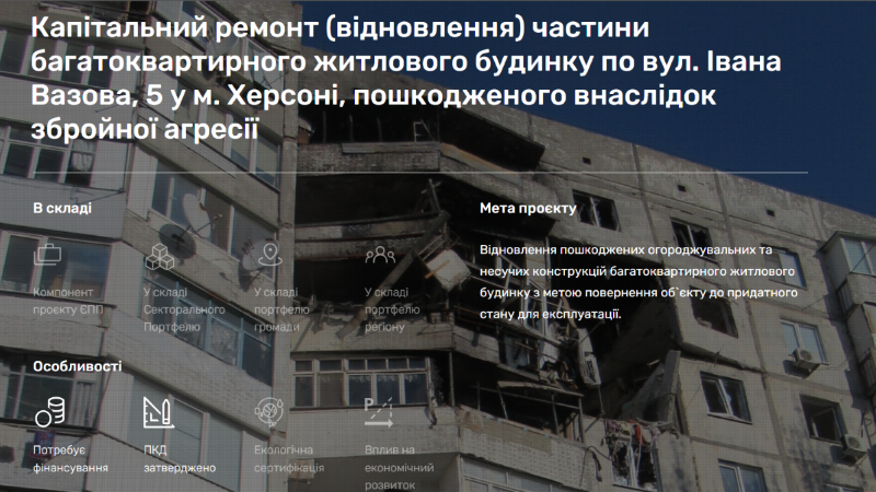Ініціатором відновлення виступила Херсонська міська рада. Балансоутримувачем будинку є ОСББ "Вазова-5". Проєкт перебуває в активному статусі — триває пошук додаткових джерел фінансування. Орієнтовна тривалість робіт після старту — чотири місяці.Також у селі Посад-Покровське Херсонського району планують відбудувати житлові будинки, зруйновані внаслідок російської агресії. Загальна вартість робіт, за попередніми оцінками, становить близько 398 мільйонів гривень.