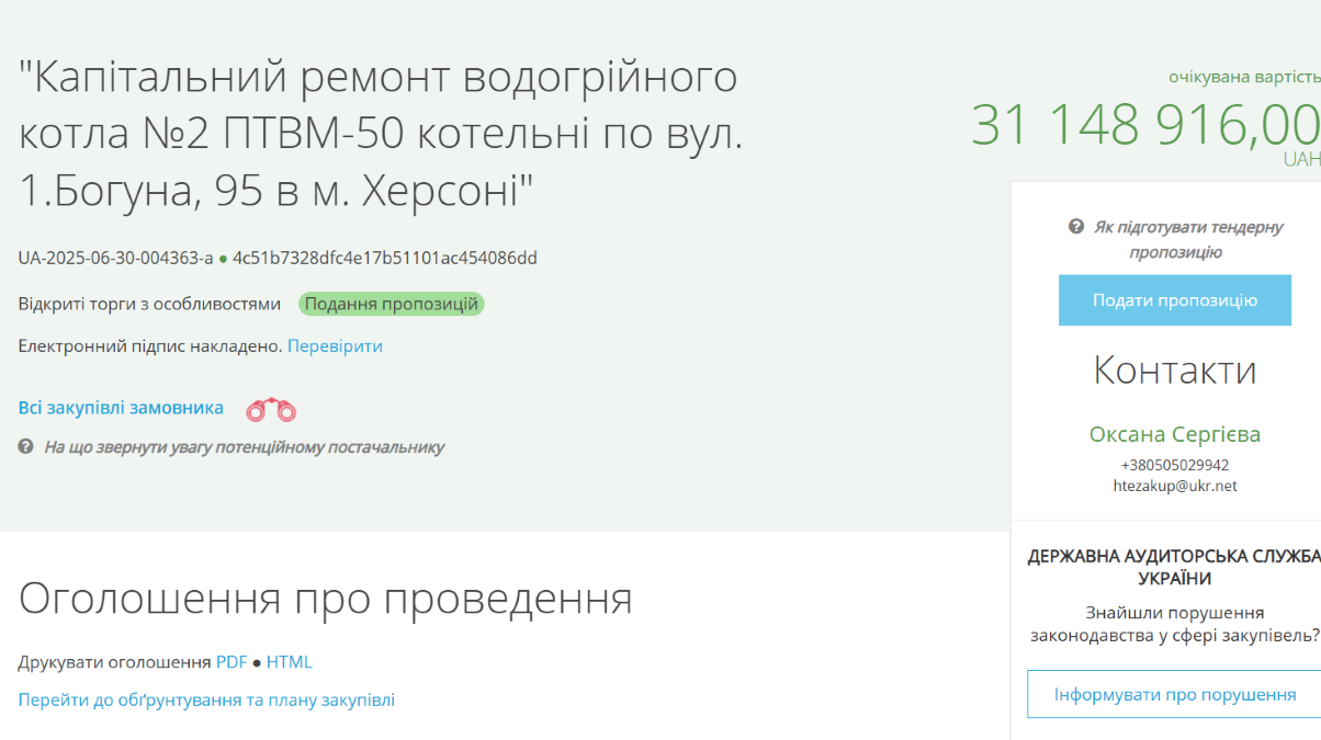 Міське комунальне підприємство "Херсонтеплоенерго" оголосило два тендери на капітальний ремонт котельного обладнання в Херсоні. Найдорожчий з них — ремонт водогрійного котла №2 ПТВМ-50 на котельні по вул. Івана Богуна, 95 — обійдеться орієнтовно у 31,1 мільйона гривень.