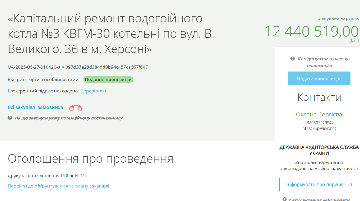 Ще один тендер — на капремонт водогрійного котла №3 КВГМ-30 на котельні по вул. Василя Великого, 36. Тут роботи планують виконати за 12,4 мільйона гривень. Торги стартують 14 липня, документи можна подавати до 13 липня. Оплата — також після виконання робіт. Розмір мінімального кроку пониження ціни становить 373 215 гривень.