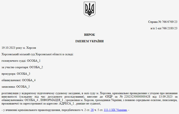 Дії жінки призвели до проголошення Росією спроби анексії Херсонщини. Засуджена визнала свою провину та сприяла розкриттю злочину.