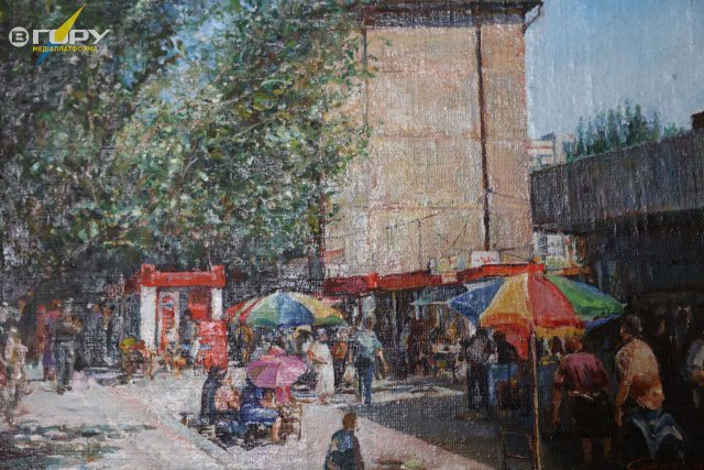 На виставці представлені картини, на яких зображені Херсон та Херсонщина. Зокрема, озеро Біле, річка Конка й зупинка “Залізнична".