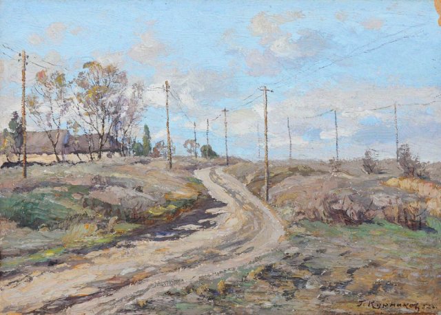 Георгій Курнаков (1887-1977). Дорога. 1952. Картон, олія. Херсонський корифей виявився рекордсменом — це четверта робота майстра, яка потрапила в об’єктив камери в музеї окупованого Криму. І це не дивує, адже наша музейна колекція налічувала майже дві з половиною сотні графічних і живописних творів художника. Звертаємо увагу на те, як «дбайливо» окупанти ставляться до викраденого, навіть перед зйомкою, заради «картинки», не навели лад — так і залишився пейзаж Курнакова скособоченим...