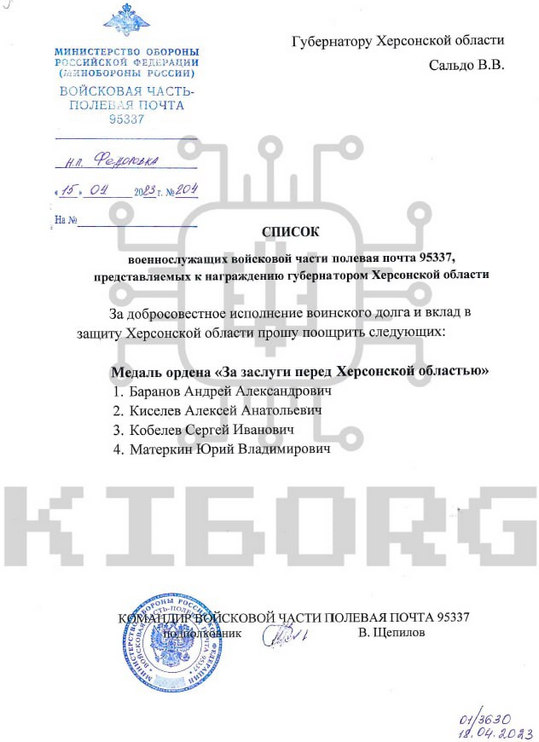 Там опублікували лист командира військової частини – польової пошти № 95337 голові окупаційної адміністрації регіону Володимиру Сальдо зі списком російських військових, яких просять нагородити орденом “За заслуги перед Херсонською областю”.