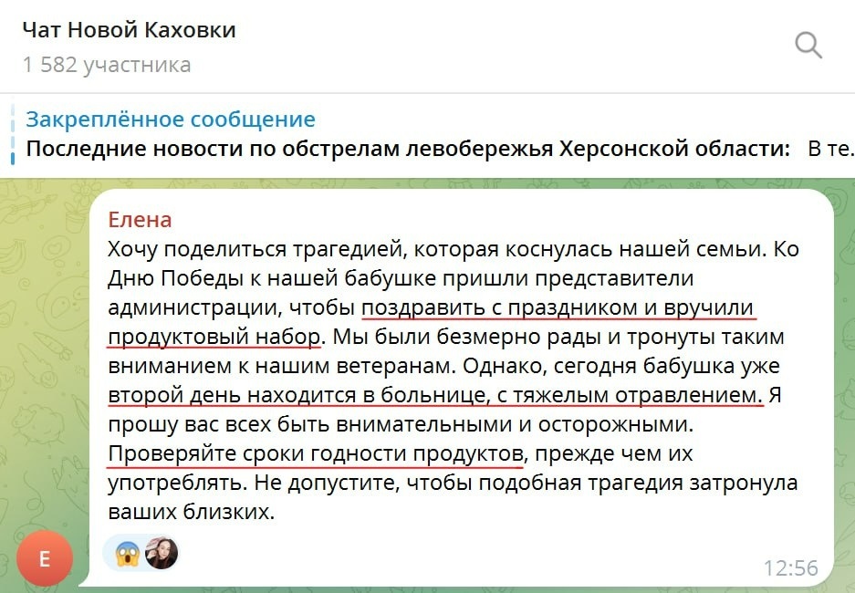 В одному з місцевих чатів жителька Нової Каховки Олена поділилася історією зі своєї родини. За її словами, напередодні 9 травня її бабусю привітали представники окупаційної адміністрації і вручили продуктовий набір. У підсумку бабуся з важким отруєнням потрапила до лікарні. Користувачка закликає земляків бути уважним до таких дарів і перевіряти термін годності.