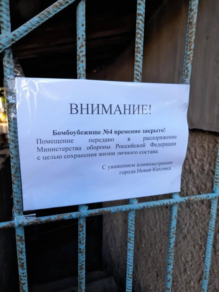 Також місцеві жителі повідомляють, що у Новій Каховці почали закривати бомбосховища. Читачі показали закриті бомбосховища з оголошеннями на них, де вказано, що вони «перейшли у розпорядження Міноборони Ф з метою збереження життя особистого складу».