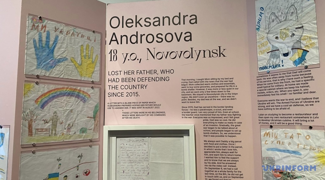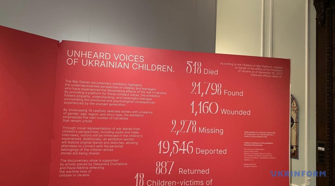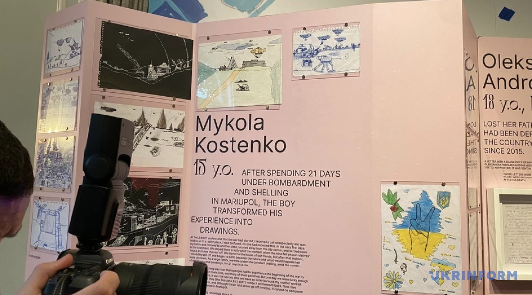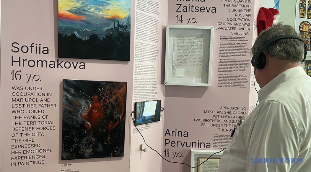 Як передає власкор Укрінформ у Нью-Йорку, експозиція включає чотирнадцять історій дітей із Донецької, Харківської, Херсонської, Київської областей. Їхні розповіді про перші місяці повномасштабного вторгнення підкріплені дитячими щоденниками, малюнками, особистими речами.