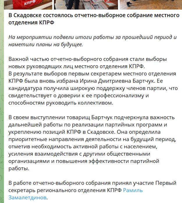 А от сталіністка Бартчук Ірина Дмитрівна, яку обрали очільницею місцевого відділення компартії, — скадовчанка: у 2020 році невдало балотувалась до Скадовської міської ради від партії «Слуга народу». Нині Бартчук також очолює окупаційний скадовський краєзнавчий музей.Комуністичні ідеї у Скадовську свого часу намагався поширювати нинішній колаборант та окупаційний заступник Сальдо Віталій Булюк. Втім, підтримка його комуністичних ідей була настільки невеликою, що він змушений був набирати голоси у 2010 році до Херсонської обласної ради: на нижчому рівні підтримки він не мав.