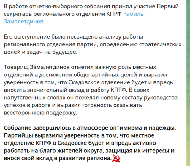 На збори приїхав зокрема Раміль Замалетдінов — перший секретар херсонського регіонального окупаційного відділення компартії Росії та заступник голови окупаційної «Херсонської обласної думи». Замалетдінов — не місцева людина, адже комуністична партія у Скадовську протягом всіх років незалежності України великої підтримки не мала, а останніми роками не мала зовсім. Раміль Замалетдінов народився 23 червня 1989 року в Ульянівську (Росія), служив в російській армії, юрист за освітою. До Херсонщини не мав жодного стосунку до окупації регіону росіянами у 2022 році. Але оскільки місцевих кадрів для реалізації російського комуністичного пропагандистського сценарію не вистачило, довелось ставлеником місцевих комуністів зробити немісцевого.