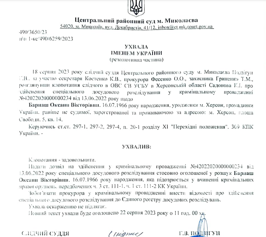 Центральний районний суд Миколаєва ухвалив проведення спеціального розслідування у справі про державну зраду екс-директорки херсонської школи Оксани Барнаш. Про це можна дізнатись на сайті Офісу Генпрокурора України.