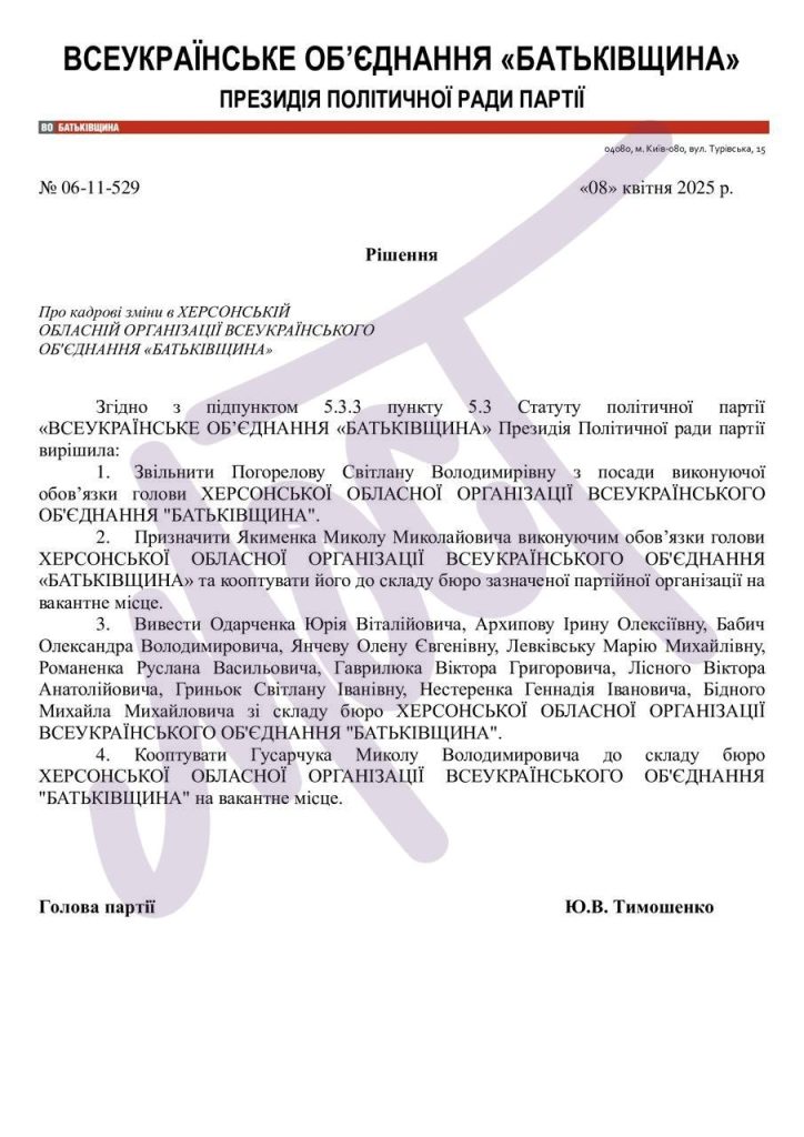 Згідно з рішенням партії, з бюро виключили: Ірину Архіпову, мера Голої Пристані, який знаходиться в полоні, Олександра Бабіча, дружину Юрія Одарченка Олену Янчеву, депутатку облради Марію Левківську, каховського бізнесмена Руслана Романенка, директора театру ляльок Віктора Гаврилюка, ексдепутата облради Віктора Лісного, депутатку Великоолександрівської селищної ради Світлану Гриньок, депутата Бериславської районної ради Михайла Бідного та депутата Каховської райради Геннадія Нестеренка.