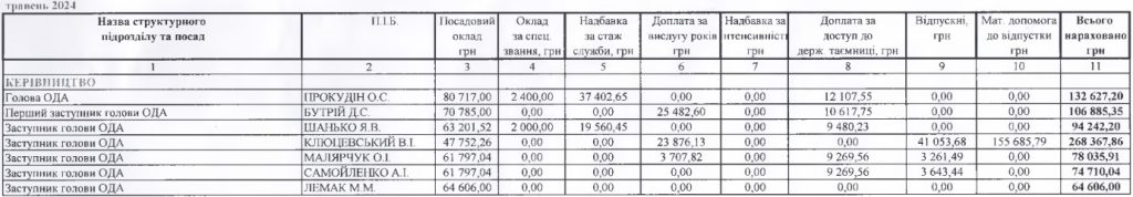Заступниця начальника ОВА Ольга Малярчук отримала 78 тисяч 35 гривень та 91 копійку. Заступник Антон Самойленко заробив 74 тисячі 710 гривень та 4 копійки. І ще одному заступнику начальника обласної військової адміністрації Михайлу Лемаку заплатили 64 тисячі 606 гривень.