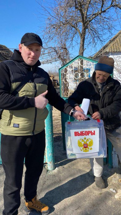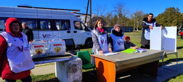 Російські окупанти та колаборанти різними методами намагаються залучити місцевих мешканців, які вимушені перебувати в окупації, «проголосувати» за президента РФ. Це побудинкові обходи членами окупаційних «виборчих комісій», створення «виборчих» дільниць на вулицях, запуск так званих «мобільних виборчих дільниць», які являють собою звичайні пасажирські автобуси «Газель» російського виробництва.