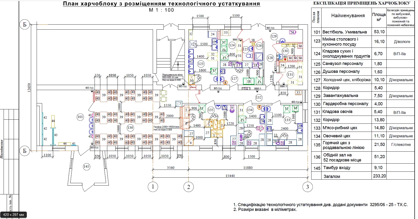 У приміщенні хочуть облаштувати обідню залу на 52 місця (зокрема два для дітей з інвалідністю), гарячий і холодний цехи, овочевий та м’ясо-рибний цехи, комори для зберігання продуктів, мийні, гардеробні, душову та санвузол для персоналу.