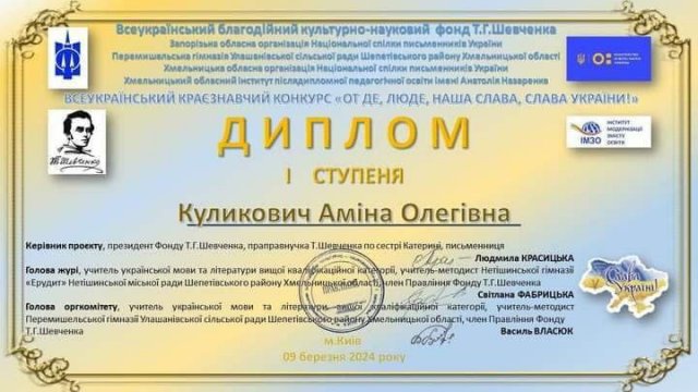 Учениця Херсонської спеціалізованої школи I-III ступенів №52 з поглибленим вивченням української мови Аліна Куликович перемогла у Всеукраїнському краєзнавчому конкурсі "От де, люде, наша слава, слава України!", присвяченому 210-й річниці з дня народження Тараса Шевченка.Про це повідомив начальник Херсонської МВА Роман Мрочко.