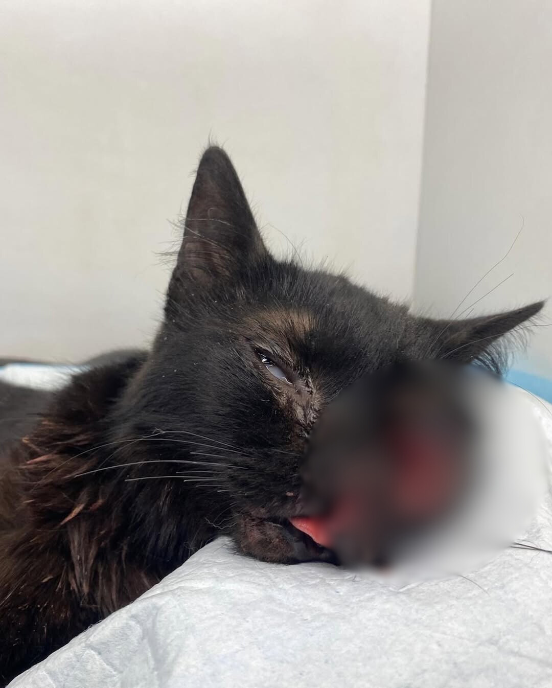 За словами Оксани, серед поранених є дуже тяжкий кіт. У нього вибите око, зламана верхня та нижня щелепа. Через отвір в оці видно язик. Йому зробили КТ:
