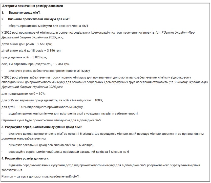 Особливість: у період економічної нестабільності в Україні при визначенні розміру допомоги використовується скоригований показник прожиткового мінімуму.