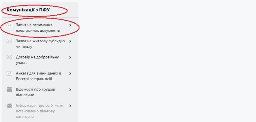 - У меню зліва знайдіть розділ "Комунікації з ПФУ" та виберіть "Запит на отримання електронних документів".