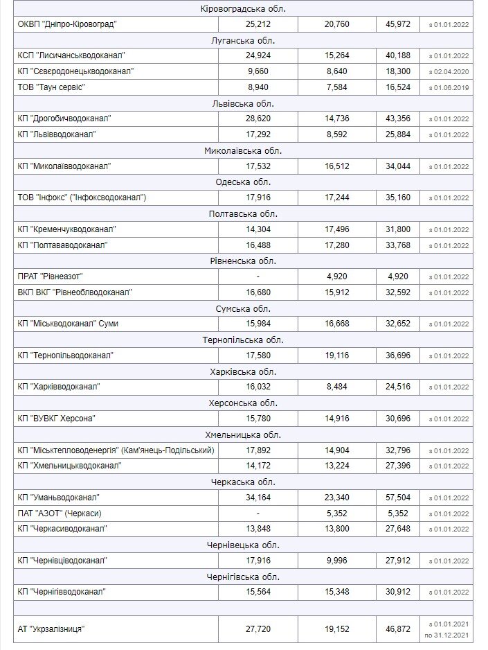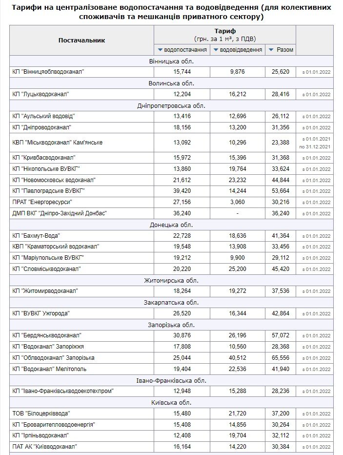 Як повідомляє Мінфін та НКРЕКП, тарифи на централізоване водопостачання та водовідведення для населення великих міст залишаються незмінними з 24 лютого 2022 року. Спроба підвищити їх на 20-30% у липні 2023 року була скасована після втручання президента та уряду.