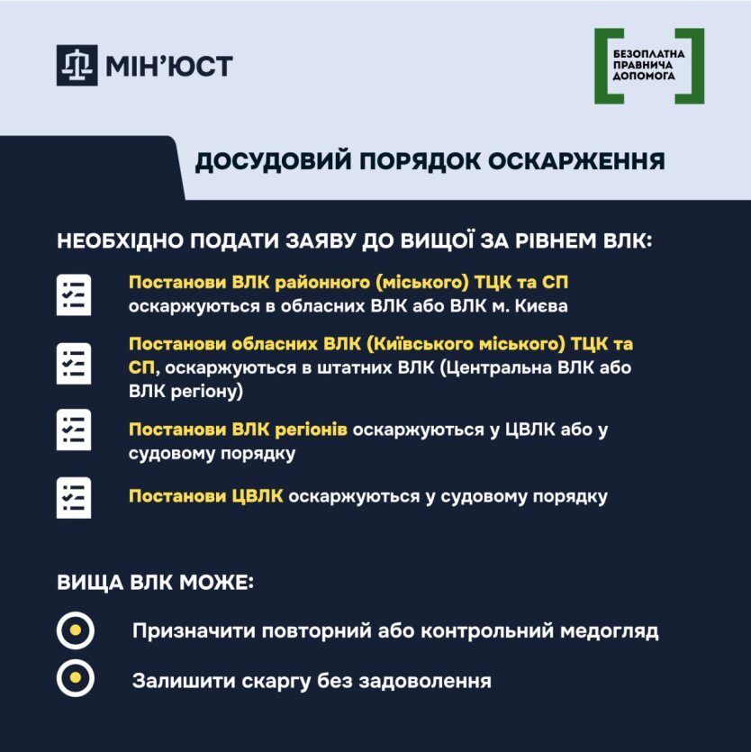 - постанови обласних ВЛК (Київського міського) ТЦК та СП оскаржуються у штатних ВЛК (Центральна ВЛК або ВЛК регіону);