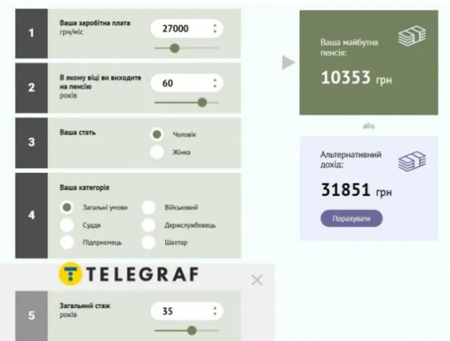 Отже, за стартові умови для розрахунку пенсії взяли повний 35-річний стаж і 60-річний вік. Пенсійний калькулятор порахував, що чоловікові такого віку і з таким стажем треба щомісяця заробляти не менше за 27 тисяч гривень, аби мати пенсію розміром у 10 тисяч гривень.
