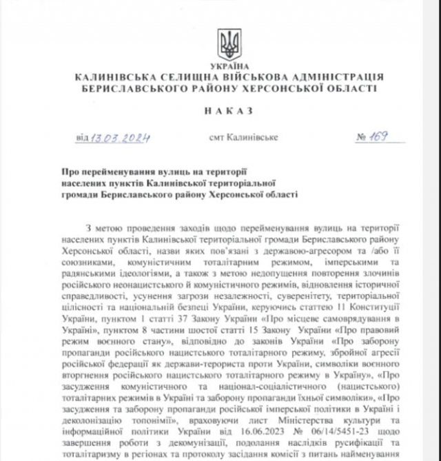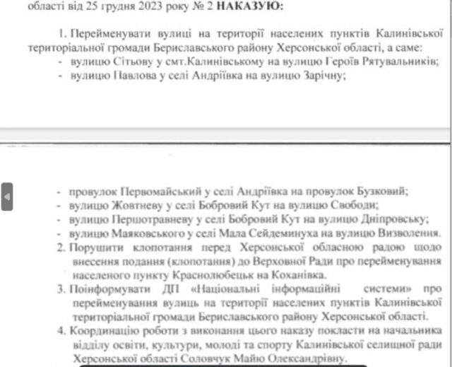 Цим розпорядженням затверджені результати громадського обговорення питання перейменування місцевих топонімів.В розпорядженні зазначено, що Калинівська військова адміністрація буде звертатися з клопотанням до Херсонської обласної ради про перейменування населеного пункту Краснолюбецьк Калинівської громади Бериславського району Херсонської області в село Коханівка.