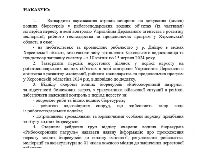 В документі зазначено, що любительське та промислове рибальство у р. Дніпро в межах Херсонської області, включаючи зону затоплення Каховського водосховища та придаткову заплавну систему – з 10 квітня по 15 червня 2024 року.