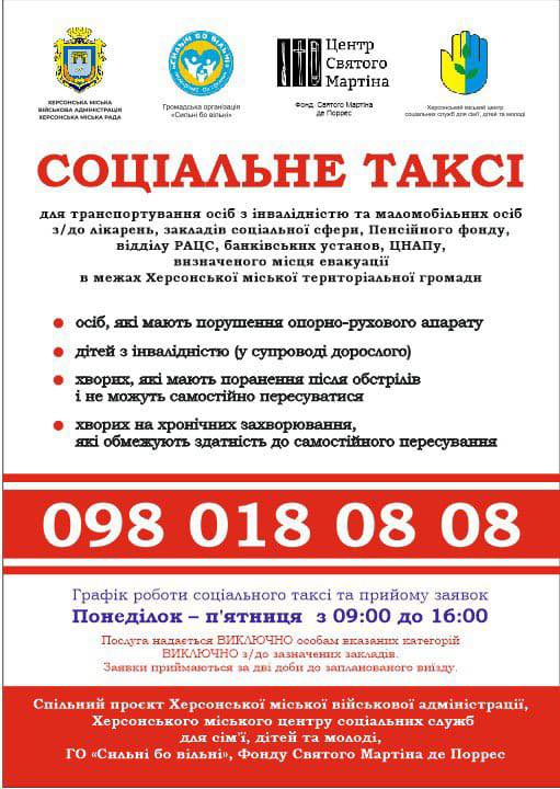 За номером +38 098 018 08 08 вже два тижні працює єдина телефонна лінія, яка розподіляє заявки між екіпажами Херсонського міського центру соціальних служб для сім'ї, дітей та молоді за підтримки Херсонської міської військової адміністрації (Херсонської міської ради) та ГО "Сильні, бо вільні" за підтримки Фонду Святого Мартіна де Порреса.