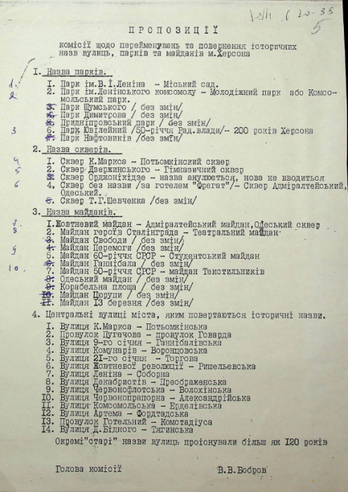 У цьому ж документі орієнтовно 1996 року, які збереглись завдяки Августу Вірличу та працівникам Державного архіву Херсонської області, можна віднайти пропозиції до перейменування топонімів у Херсоні, переважна частина яких стала основою до перейменувань у 2016 році: із поступовим позбавленням комуністичної ідеології, але процвітанням ідеології імперської, яку тоді, нагадаємо, у Херсоні сприймали переважно позитивно. Спойлер: перейменування тоді провалилось і чекало свого часу майже 20 років.