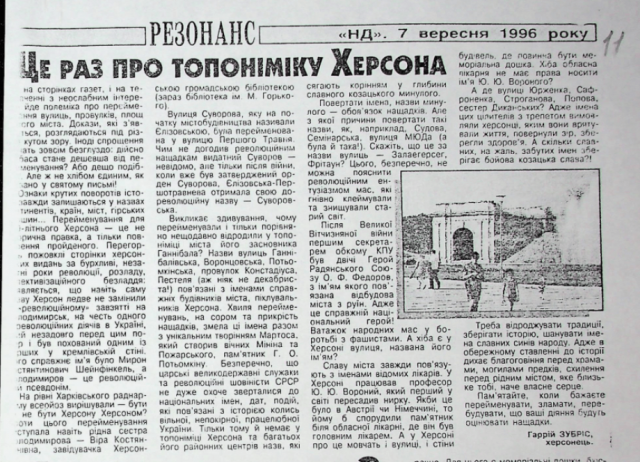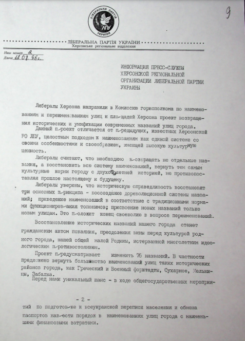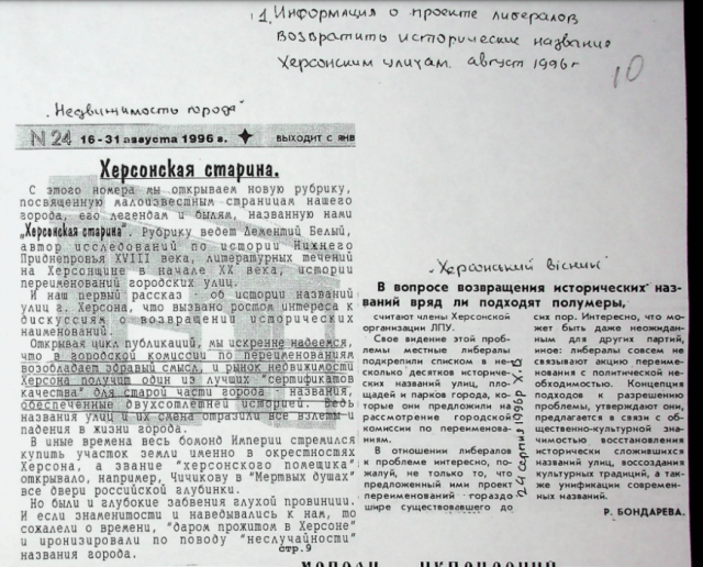 В херсонському архіві збереглись дані щодо тодішньої кампанії з перейменувань, в яких активну участь брали громаддські діячі, науковці — частина з них була політиками. Приміром, ось такий лист від Ліберальної партії України від 1996 року з прикріпленими фрагментами тодішніх газетних матеріалів ми віднайшли в Державному архіві Херсонської області (справи Августа Вірлича).