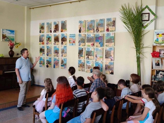 На виставці представлено роботи учнів школи мистецтв №1 Херсона — юні художники у своїх роботах відтворили улюблені вулички, знайомі пейзажі, пам’ятки архітектури.