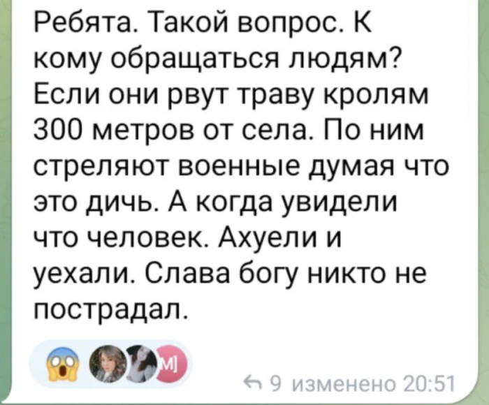 Місцеві мешканці повідомили, що росіяни відкрили по ним вогонь під час того, як вони збирали у полі траву для кролів. Зрозумівши, що це не дикі тварини, а люди – окупанти швидко поїхали з місця події.Цей випадок підкреслює недбалість та байдужість окупаційних сил до місцевої флори і фауни, а також до безпеки місцевого населення. Спроби захоплення та руйнування природних ресурсів, які відбуваються неподалік від житлових зон, створюють серйозні загрози як для місцевої екосистеми, так і для життя людей.