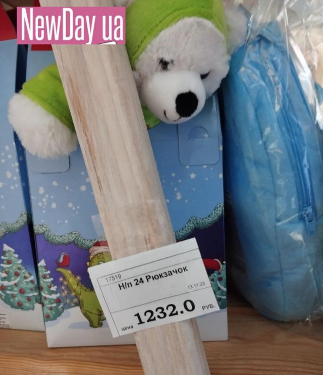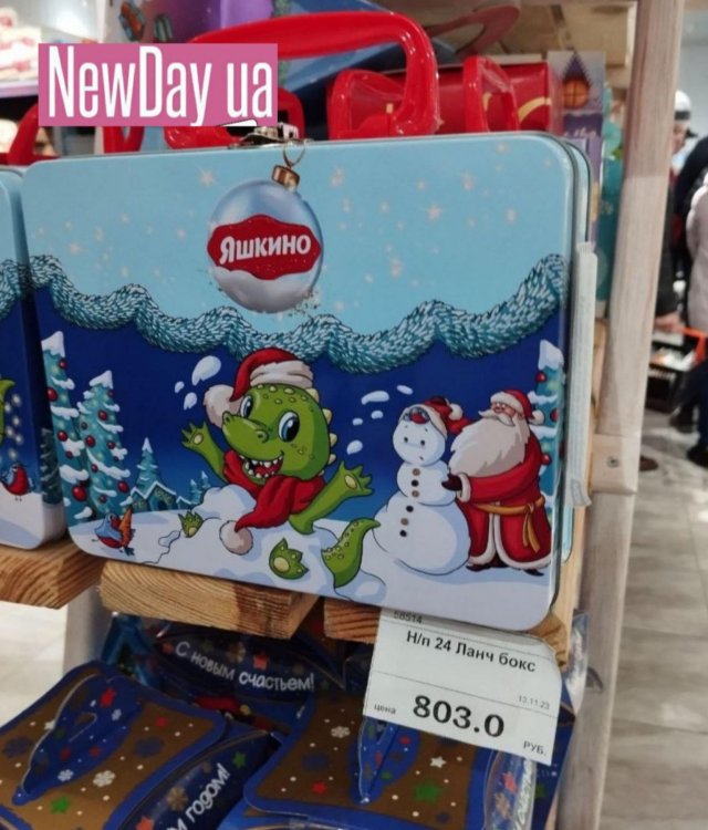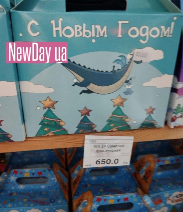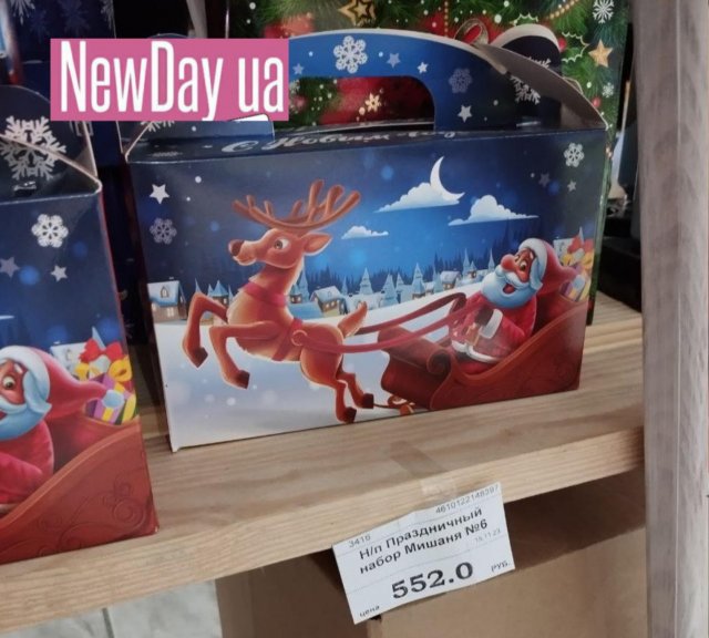 Ялинки у «столиці» окупованої частини Херсонщини ще не встановлюють. Рано. А от подарункові набори солодощів у магазинах Генічеська вже з’явились. Однак ціни у них такі, що не кожен собі дозволить купити.Солодкий набір «Мишаня» у картонній коробці коштує аж 552 рублі. Називається він так тому, що на зворотній стороні можна побачити зображення білого ведмедя. А от на лицьовій чомусь зображено «нєскрєпного» Санта Клауса. Шапка у нього з помпоном, а сані запряжені оленем. На відміну від Діда Мороза, який запрягає білих коней і має інший головний убір.